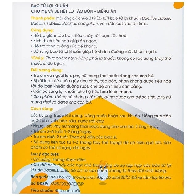 Mỗi ống có chứa 3 tỷ (3x10ˆ9) bào tử lợi khuẩn Bacillus subtilis, Bacillus clausii, Bacillus coagulans và nước cất vừa đủ 5 mL.