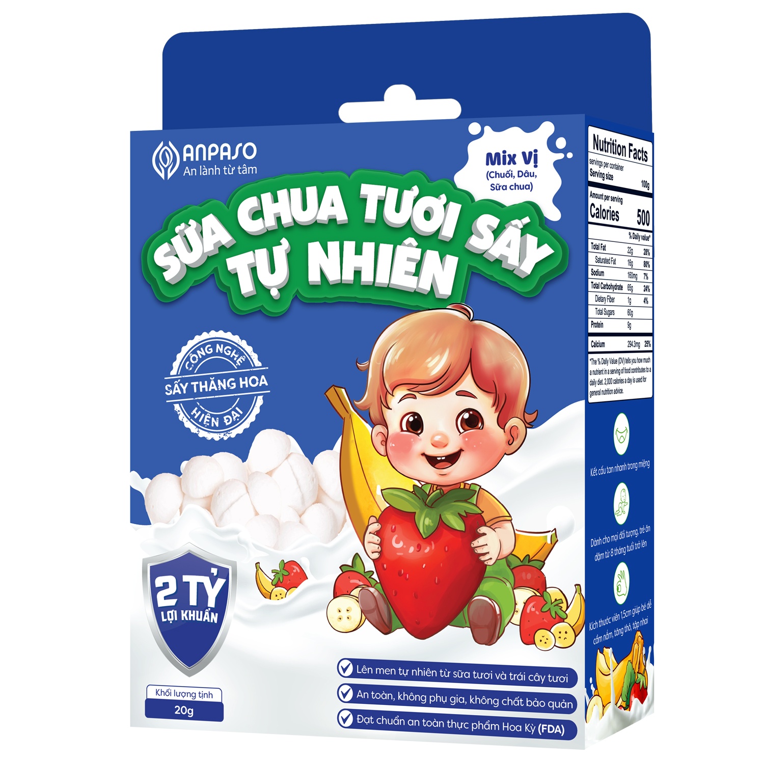 - Sữa chua tươi sấy tự nhiên của Anpaso được lên men tự nhiên từ sữa tươi và sử dụng hoa quả tươi để tăng hương vị, không sử dụng các loại trái cây khô hoặc bột hoa quả.