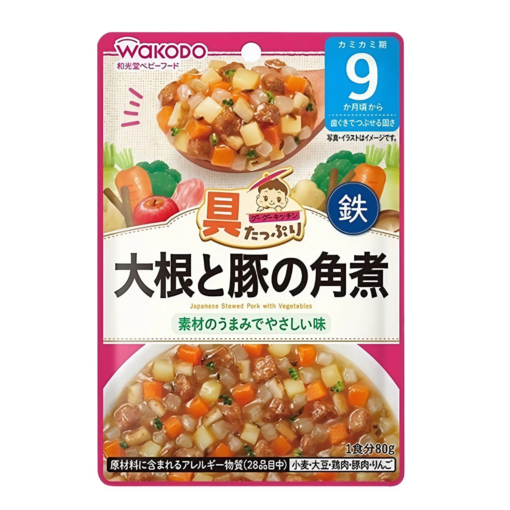 Thịt heo và rau củ hầm kiểu Nhật Wakodo 80g là thực phẩm bổ sung dinh dưỡng lý tưởng dành cho bé từ 9 tháng tuổi trở lên. Sản phẩm được sản xuất và nhập khẩu trực tiếp từ Nhật Bản, sử dụng nguyên liệu tươi ngon, tự nhiên, không chứa chất bảo quản, giúp mẹ an tâm khi lựa chọn cho bé yêu.